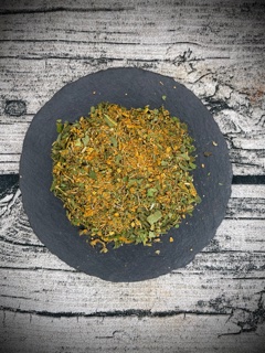 Bockshornklee, Meersalz 13%, Paprika, Thymian, Pfeffer, Schnittlauch, Bärlauch, Petersilie, Brennessel, Zucker 3%, Majoran.