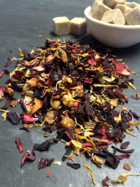 Zutatenliste: Hibiscus, Apfelstücke mit Vit. C, Hagebutten, Aroma, Vanillestückchen, Ringelblumenblüten