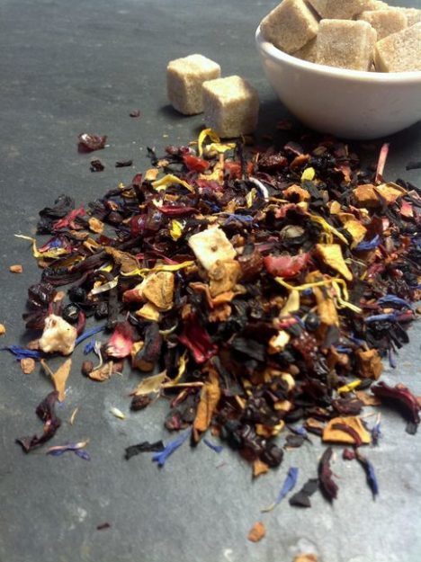 Hibiskus, Apfel gesäuert (Apfel, Säuerungsmittel Zitronensäure, Vitamin C) Hagebuttenschalen, Cranberries, Holunderbeeren, Aroma, Ringelblumenblüten, Kornblumenblüten