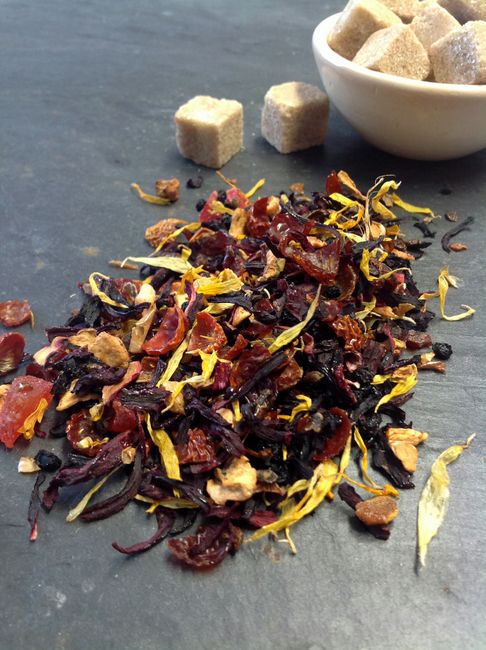 Hibiscus, Apfelstücke mit Vitamin C, Hagebutten, Holunderbeeren, Ringelblumenblüten, Erdbeerstückchen, Aroma
