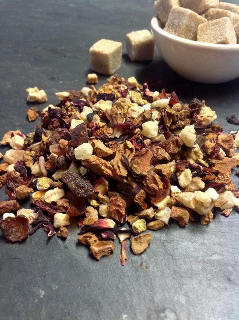 Apfel-, Ananasstücke, Sultaninen, Hagebuttenschalen, Hibiscus, Aroma