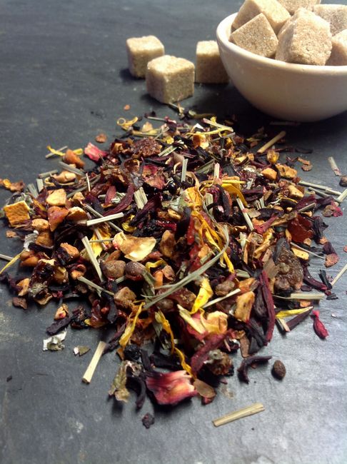Hibiscus, Apfelstücke mit Vitamin C, Hagebutten, Erdbeerstücke, Lemongras, Aroma, Himbeerblätter, Ringelblumenblüten