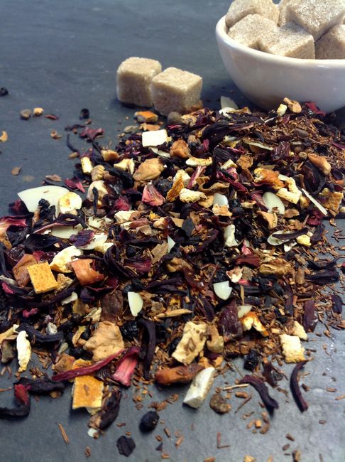 Hibiscus, Apfelstücke mit Vitamin C, Hagebutten, Sultaninen, Orangenschalen, Holunderbeeren, Zitronenschalen, Mandeln, Coriander, Zimt, Sternanis, Wacholderbeeren, Cardamom, Nelken, Piment, Anis, Aromen