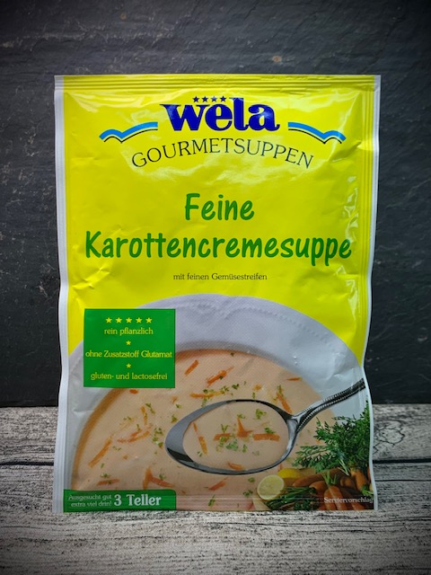 Karotten 18 %, Weizenmehl, , Milchzucker, Kartoffeln, Sahnepulver, , Sellerie, Karottenextrakt, Petersilienwurzel, Paprikaextrakt, Gewürze (Muskatblüte, Pfeffer), Petersilie, Dill, Aroma.