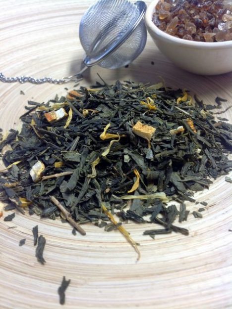 Zutatenliste: Grüner Tee Sencha, Orangenschalen, Aroma, Ringelblumenblüten