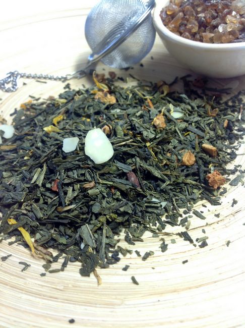 Zutatenliste: Grüner Tee Sencha, Apfelstücke, Mandeln, Aroma, Ringelblumenblüten