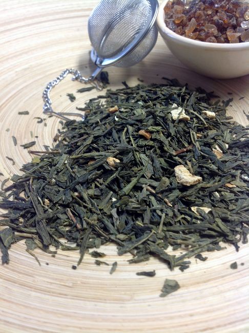 Grüner Sencha-Tee, Zitronenschalen, reines Bergamotteöl