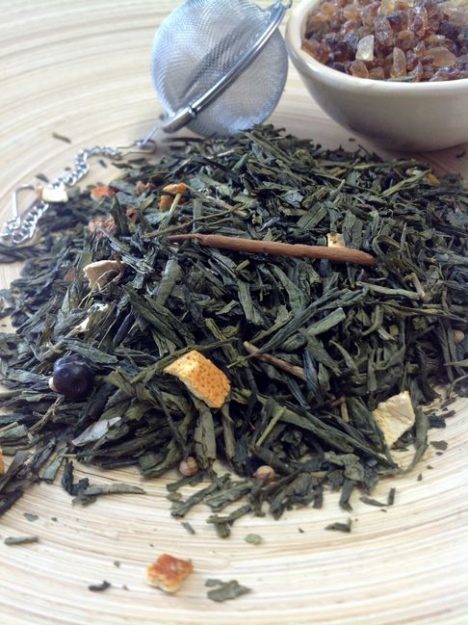 Grüner Tee Sencha, Orangenschalen geschnitten, Zimtstangen, Sternanis ganz, Cardamom, Mandelblättchen, Nelken ganz, Aroma