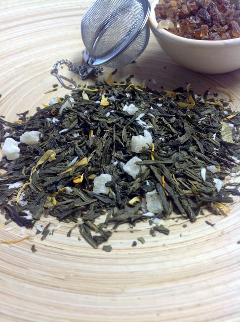 Grüner Sencha-Tee, Ananasstücke, Kokosflocken, Aroma, Ringelblumenblüten