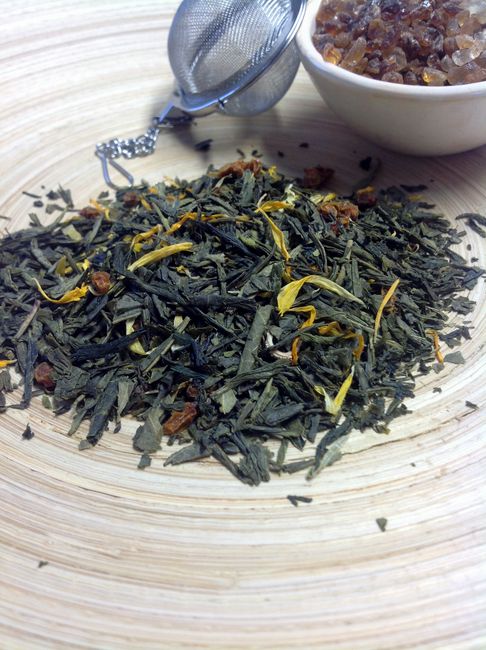 Grüner Sencha-Tee, Sanddornbeeren, Aroma, Ringelblumenblüten