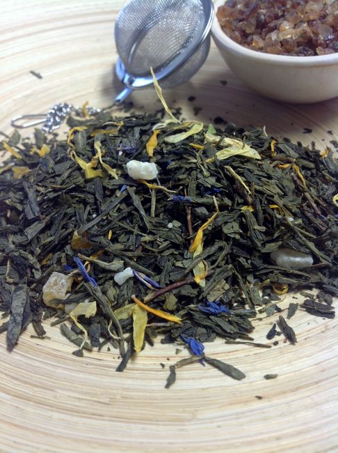 Grüner Sencha-Tee, kandierte Ananas- Kiwi- Aprikosen- Papayastücke, Aroma, Ringelblumenblüten, Kornblumenblüten