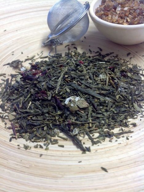 Grüner Sencha-Tee, Hagebuttenstücke, Hibiskus, Himbeerblätter, Aroma