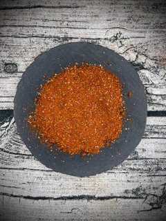 Paprika (süß, scharf, Flocken), Zwiebel, Meersalz 9%, Pfeffer, Kümmel, Piment, Koriander, Knoblauch, Zucker 1%, Lorbeerblatt.