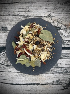 Senfkörner, Dillsaat, Zwiebelscheiben, Coriander, Pfeffer schwarz, Paprikaflocken, Piment, Wacholderbeeren, Lorbeerblätter, Chillies.