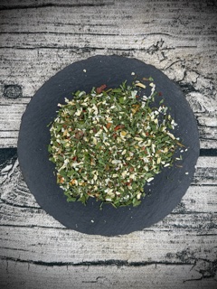 Zwiebel, Schnittlauch, Kräutermischung, Meersalz 10 %, Paprikagranulat, Pfeffer weiß, Knoblauchgranulat, Liebstöckel, Chillies, Petersilie, Muskat, Zucker 1 %.