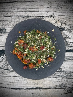 Tomatenflocken, Zwiebeln, Knoblauch, Salz, Petersilie, Suppe, Kerbel, Bohnenkraut, Liebstöckel, Rauchsalz, geschrotete Chillies.