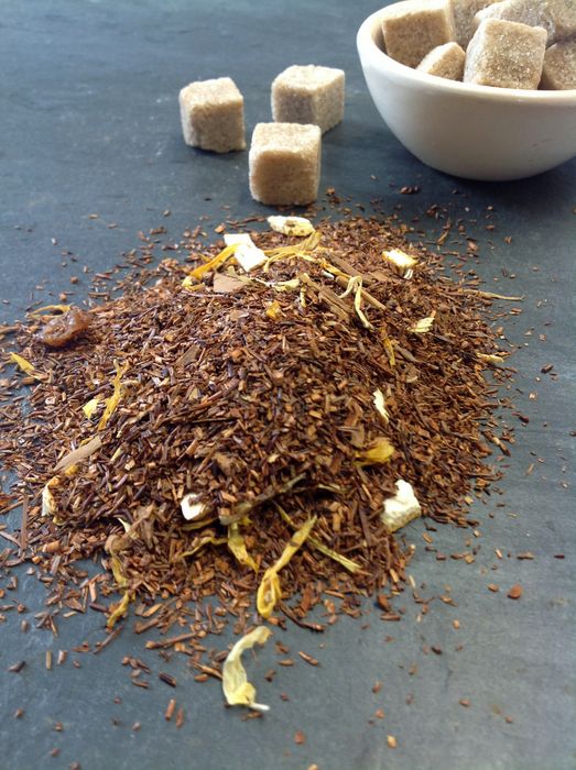 Rotbuschtee, Sultaninen, Orangenschalen, Zimt, Sternanis, Mandelblättchen, Nelken, Aromen, Ringelblumenblüten