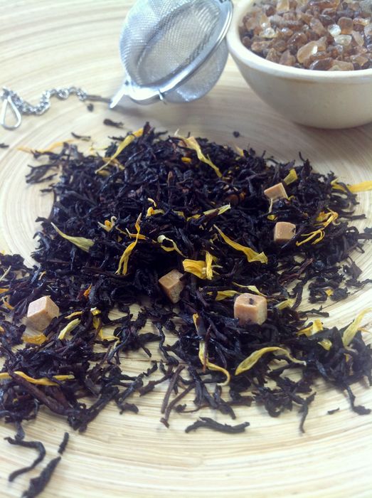 Schwarztee, Sahne-Karamel-Stücke (Magerkondensmilch gezuckert, Zucker,Glucosesirup, Butterfett, Sorbitsirup E4 20, Emulgatoren E471), Aoma, Ringelblumenblüten